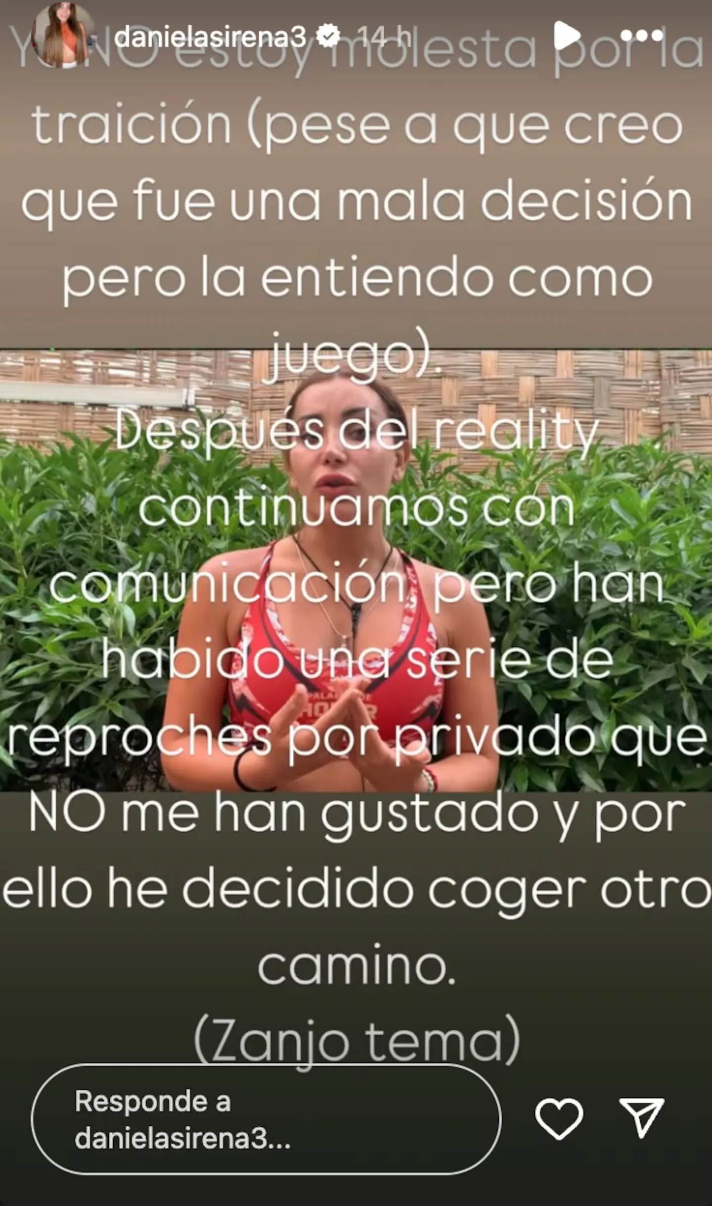 En ese sentido, recalcó que "después del reality continuamos con comunicación, pero ha habido una serie de reproches por privado que no me han gustado, y por ello he decidido coger otro camino. (Zanjo tema)”.