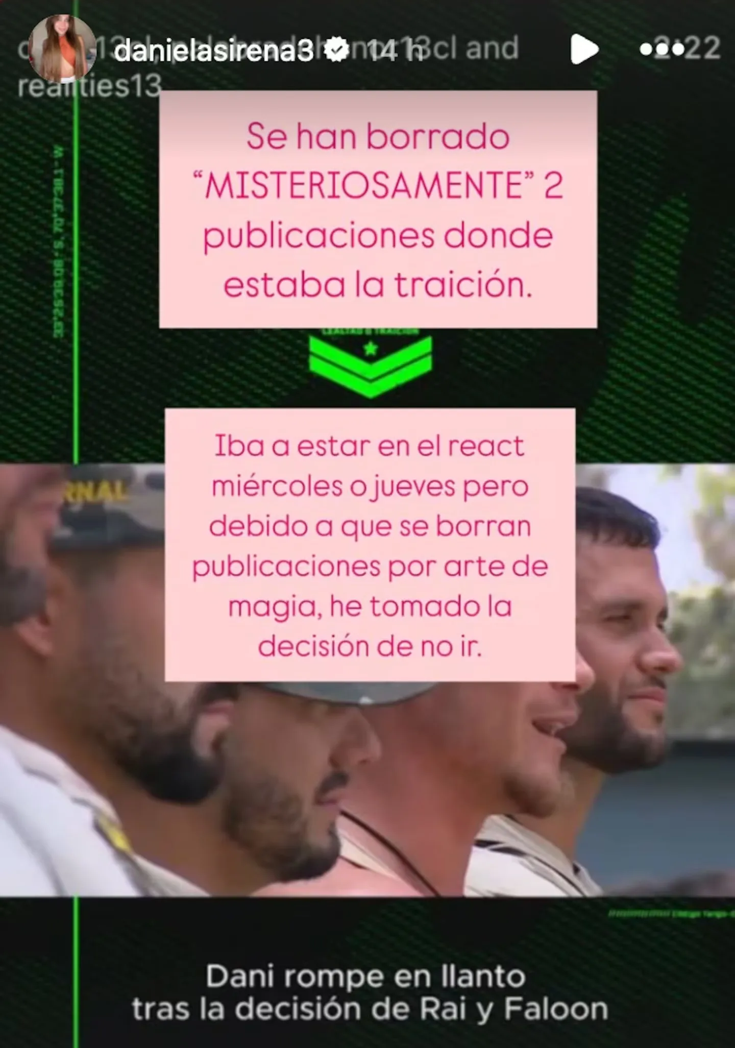 “Se han borrado ‘misteriosamente’ dos publicaciones donde estaba la traición. Iba a estar en el react el miércoles o jueves, pero debidamente porque se borraron las publicaciones por arte de magia, he tomado la decisión de no ir”, lanzó.