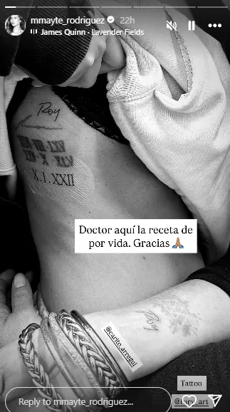 “Doctor aquí la receta de por vida. Gracias”, expresó Mayte en su Instagram, junto con un agradecimiento al tatuador.
