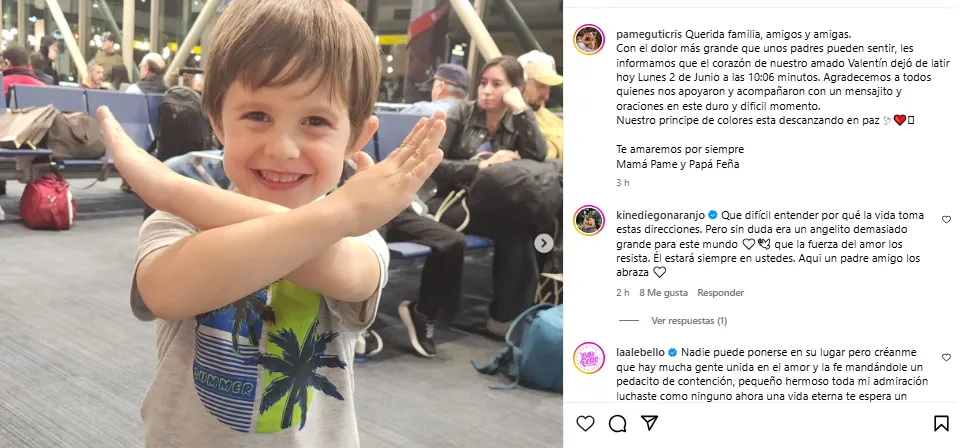 "Nuestro príncipe de colores está descansando en paz. Te amaremos por siempre. Mamá Pame y Papá Feña", concluyó el mensaje la madre, quien además se llenó de comentarios donde los usuarios le enviaron toda la fuerza para este complejo momento familiar.