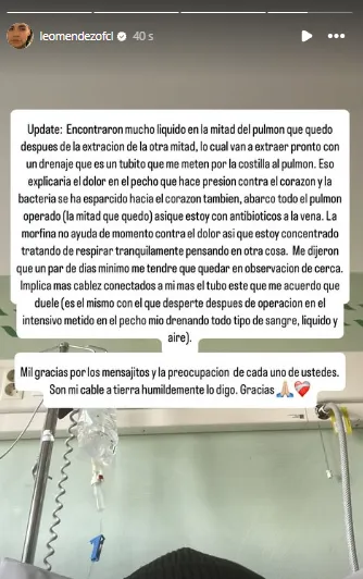 Ahora, en una nueva actualización, el joven de 27 años informó que le "encontraron mucho líquido en la mitad del pulmón que quedó después de la extracción de la otra mitad".