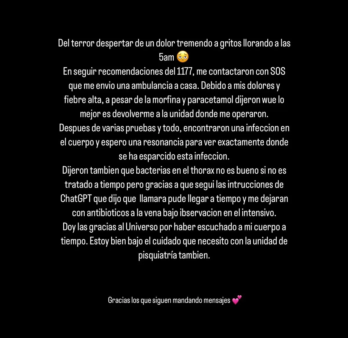"Dijeron también que tener bacterias en el tórax no es bueno, si no es tratado a tiempo, pero gracias a que seguí las instrucciones de ChatGPT que dijo que llamara pude llegar a tiempo y me dejarán con antibióticos a la vena bajo observación en cuidados intensivos".