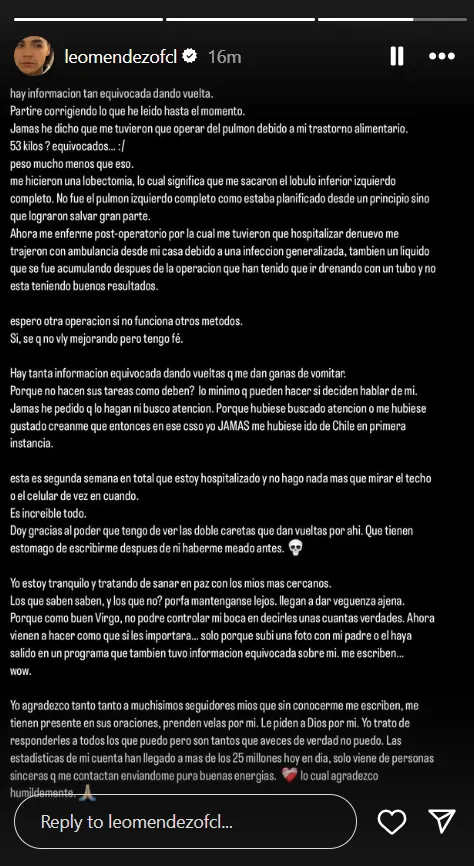 En tanto, respecto a su cirugía de pulmón, el joven aclaró que en la cirugía de pulmón a la que se sometió hace algunos días, lograron salvarle gran parte de su órgano vital.