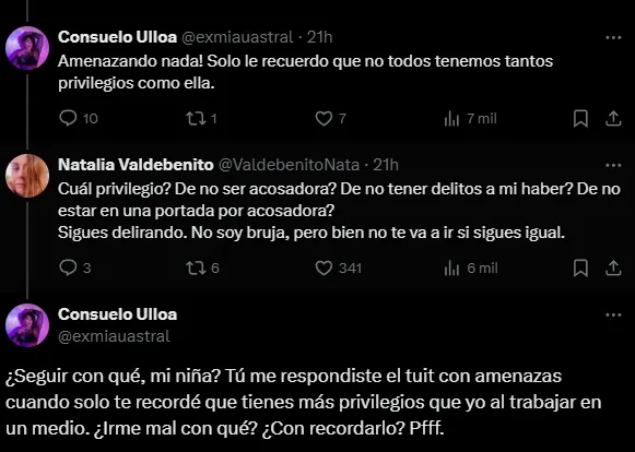 "¿Cuál privilegio? ¿De no ser acosadora? ¿De no tener delitos a mi haber? ¿De no estar en una portada por acosadora? Sigues delirando. No soy bruja, pero bien no te va a ir si sigues igual", lanzó Natalia.