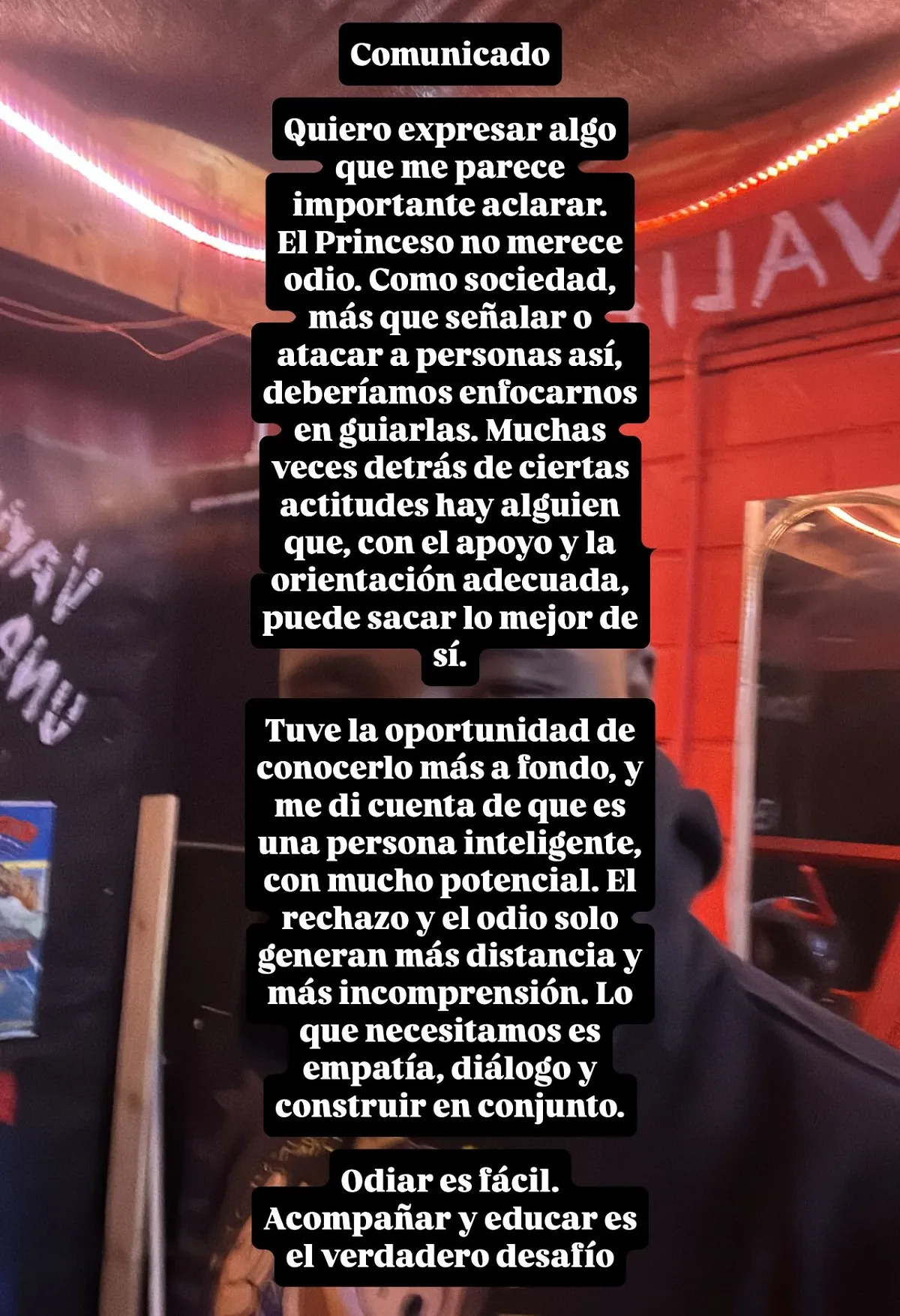 Para ello, el primer eliminado de Mundos Opuestos partió escribiendo: "Quiero expresar algo que me parece importante aclarar. El Princeso no merece odio".