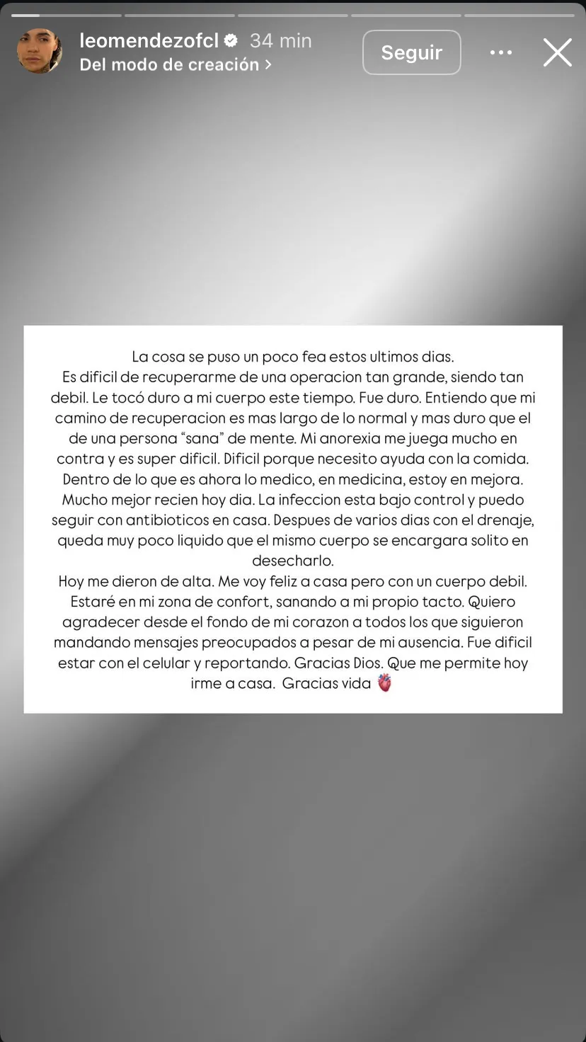 A través de sus redes sociales, el hijo de DJ Méndez compartió que finalmente recibió el alta médica: “Hoy me dieron de alta. Me voy feliz a casa, pero con un cuerpo débil”, expresó en su Instagram.