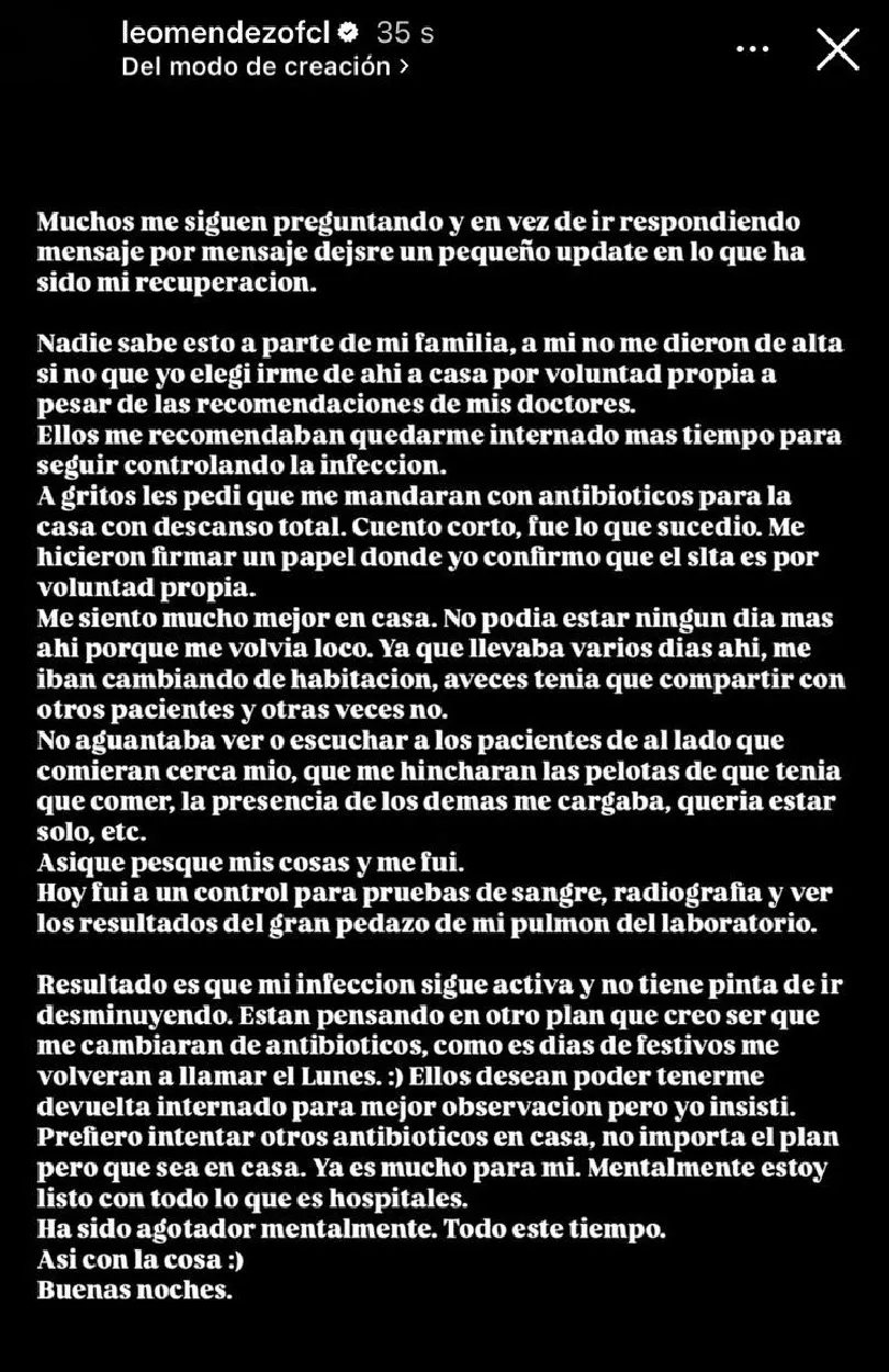 Así las cosas, el hijo de DJ Méndez reveló este jueves que la decisión de abandonar la hospitalización fue suya y no de los médicos. Ante las preguntas de sus seguidores, él decidió contarlo todo.