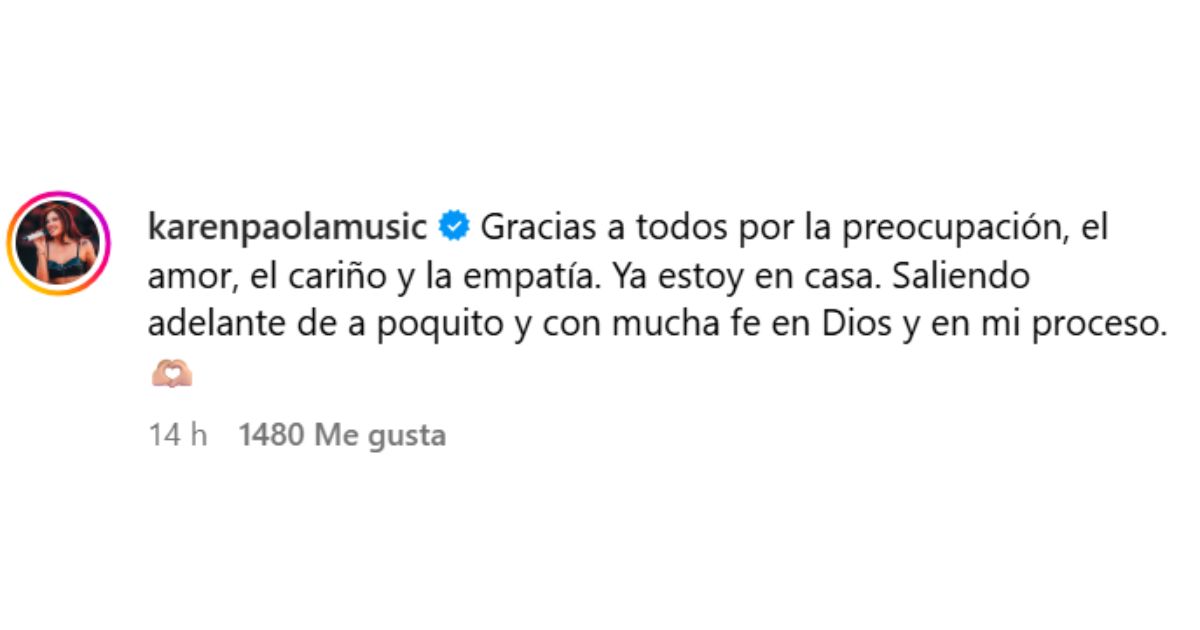 “Gracias a todos por la preocupación, el amor, el cariño y la empatía. Ya estoy en casa. Saliendo adelante de a poquito y con mucha fe en Dios y en mi proceso”, escribió.