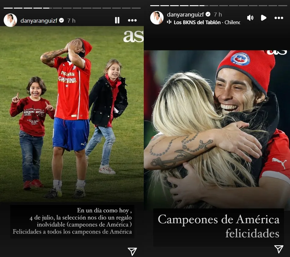 En tanto, en la siguiente publicación, Daniela Aránguiz aparece abrazada a Jorge Valdivia, mientras celebran el flamante título deportivo. "Campeones de América. Felicidades", añadió la panelista de Sígueme.