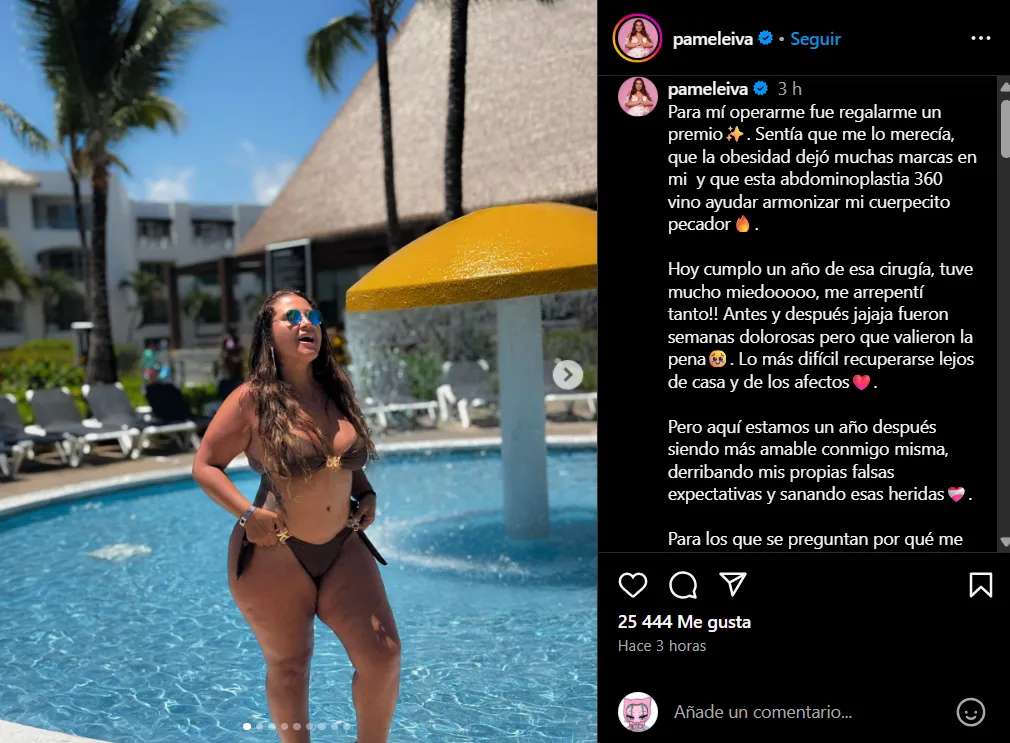 La comediante Pamela Leiva celebró en Instagram el primer aniversario de su cirugía estética de abdominoplastia, destacando que fue un regalo para sí misma tras luchar contra la obesidad. A pesar de semanas dolorosas y miedo inicial, la humorista valoró los resultados físicos y emocionales, aunque admitió las dificultades de recuperarse lejos de casa. Leiva reflexionó sobre la importancia de ser amable consigo misma y de respetar la decisión personal de cada individuo respecto a su cuerpo.