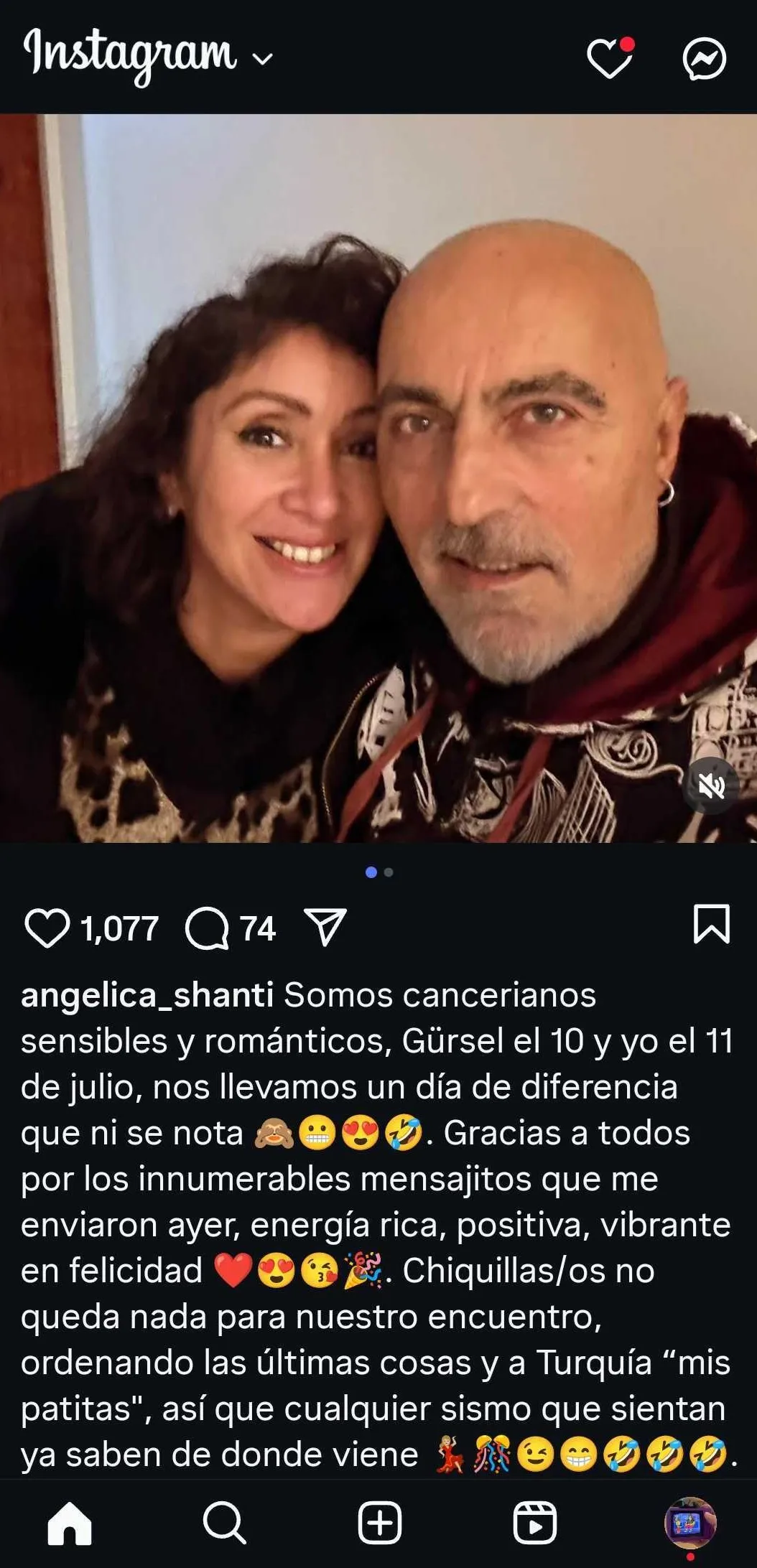 "Somos cancerianos, sensibles y románticos, Gürsel el 10 y yo el 11 de julio, nos llevamos un día de diferencia, que ni se nota", expresó en la publicación.