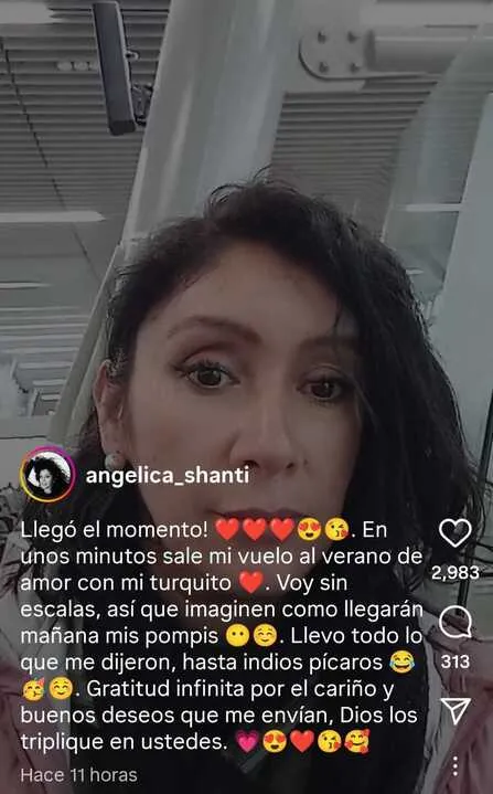 La ex Gran Hermano, Angélica Sepúlveda, anunció en Instagram su viaje a Turquía para reunirse con su novio turco, Gürsel Saglam. En un video de despedida en el aeropuerto, reveló que tendría un día de viaje sin dormir, y compró un pasaje sin escalas para llegar lo antes posible. Agradeció el apoyo de sus seguidores y expresó emoción ante el "verano de amor" con su pareja extranjera.