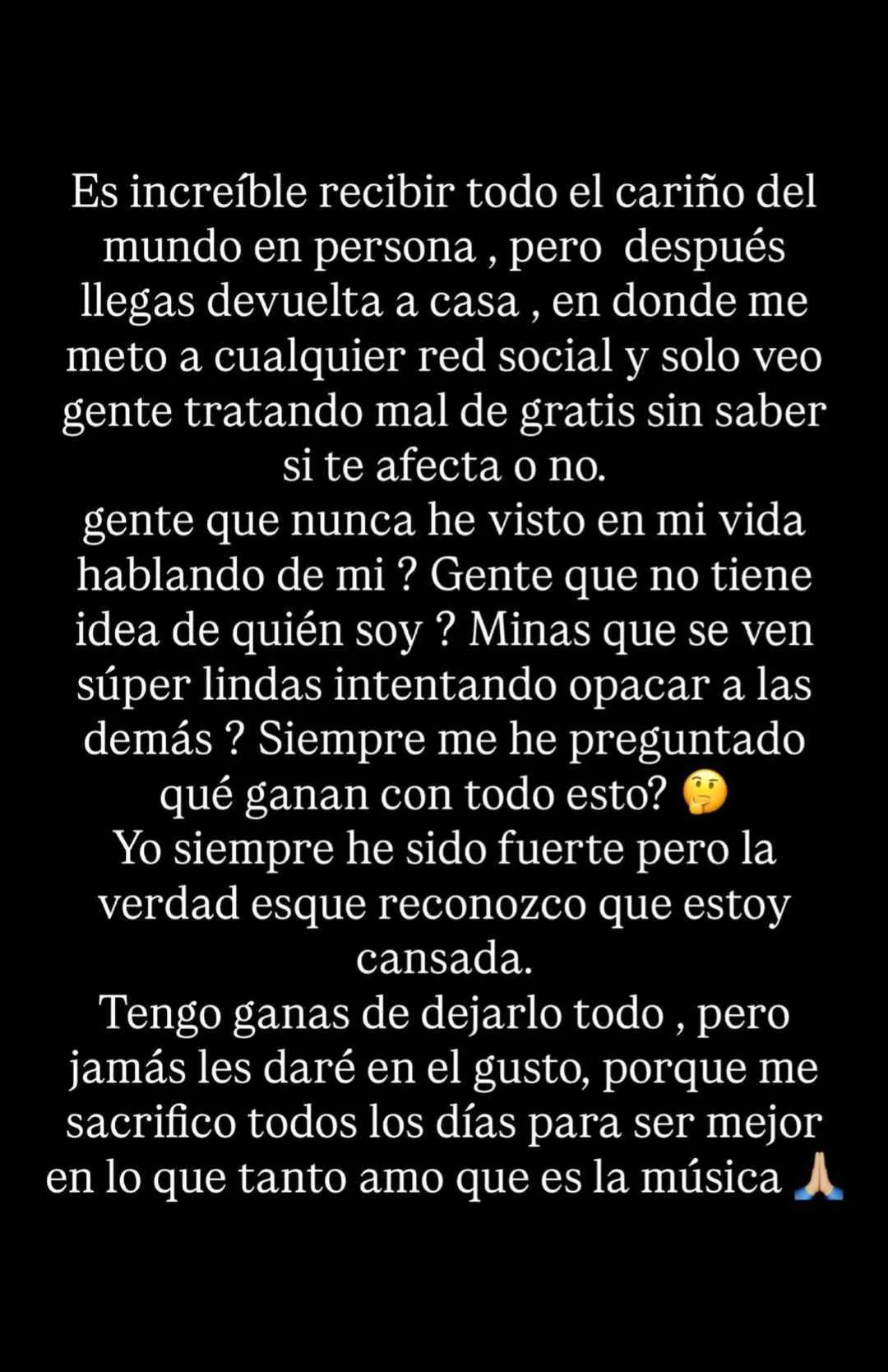 Finalmente, sostuvo que "tengo ganas de dejarlo todo, pero jamás les daré en el gusto, porque me sacrifico todos los días para ser mejor en lo que tanto amo, que es la música".