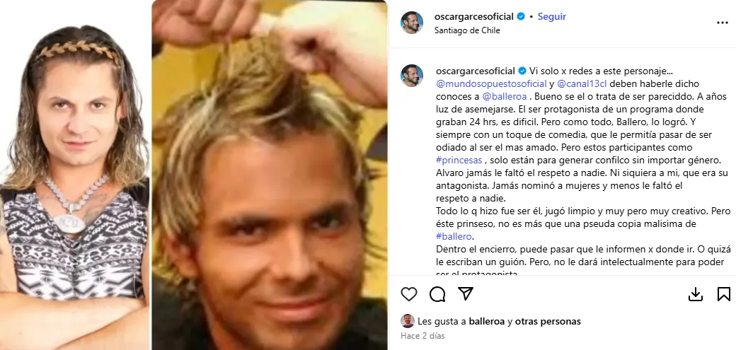 Óscar Garcés, finalista de Protagonistas de la Fama, arremetió contra Princeso, ex participante de Mundos Opuestos, acusándolo de ser una mala imitación de Álvaro Ballero. En una publicación en Instagram, Garcés elogió a Ballero por su autenticidad y creatividad, criticando a Princeso por generar conflictos y carecer de originalidad. Según Garcés, Ballero supo jugar limpio y ser amado por su humor, mientras que Princeso solo busca generar polémica sin respeto. Finalmente, resaltó la importancia de Ballero en la televisión chilena y cuestionó la falta de talento de Princeso para destacar en el encierro televisivo.