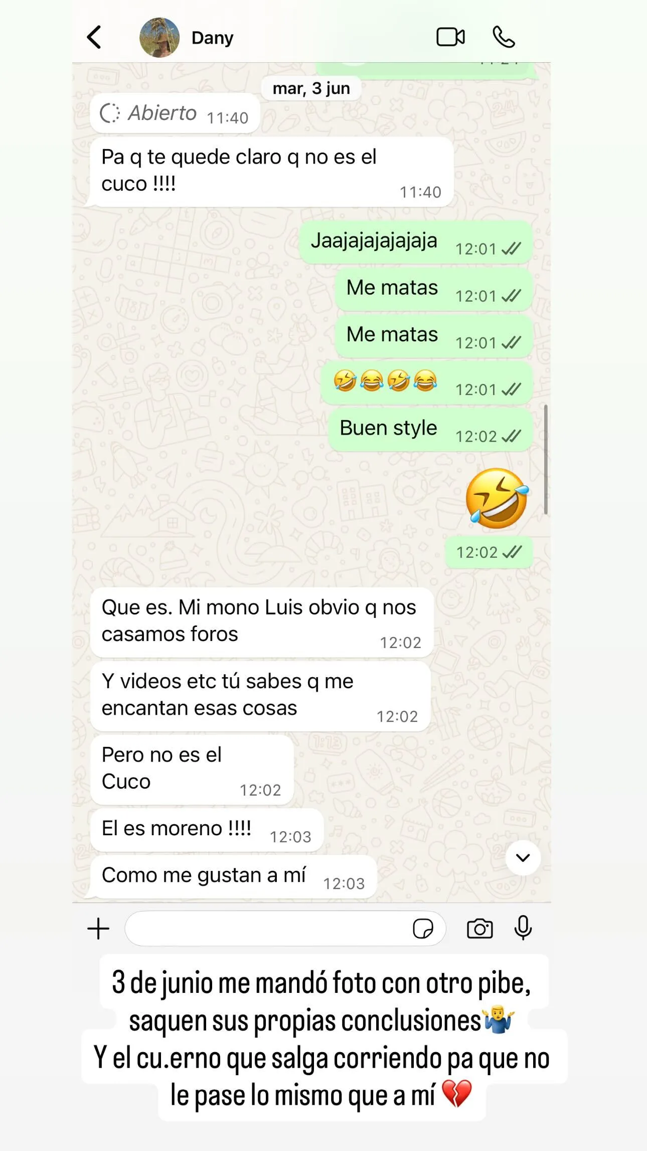 De esta forma, exhibió una presunta captura de su chat con ella, donde se ve que la panelista le envió una foto efímera, junto con el mensaje: "Pa' que te quede claro que no es el Cuco".
