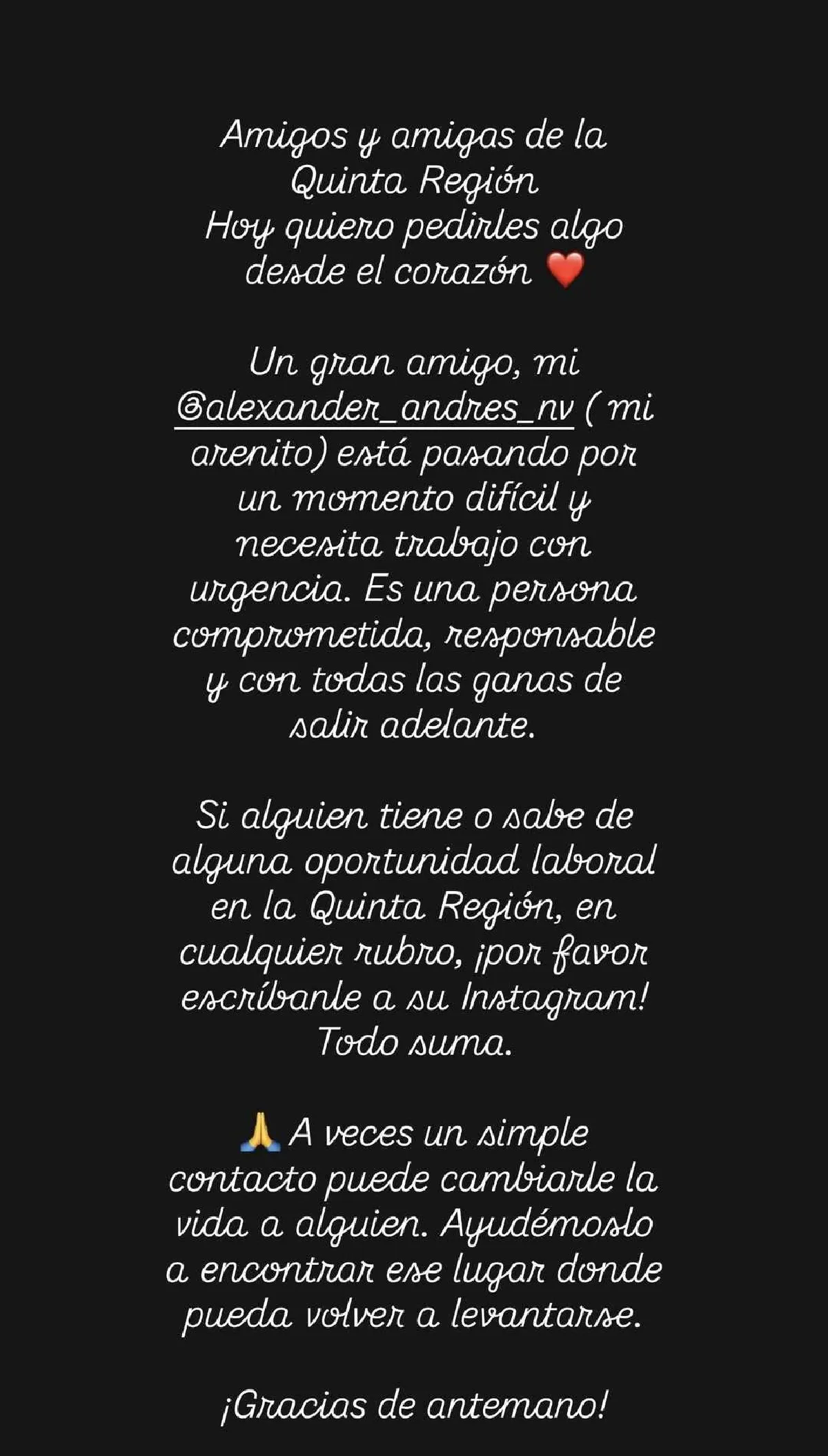 "Amigos y amigas de la quinta región, hoy quiero pedirles algo desde el corazón. Un gran amigo, mi @alexander_amdres_nv (mi Arenito) está pasando por un momento difícil y necesita trabajo con urgencia".
