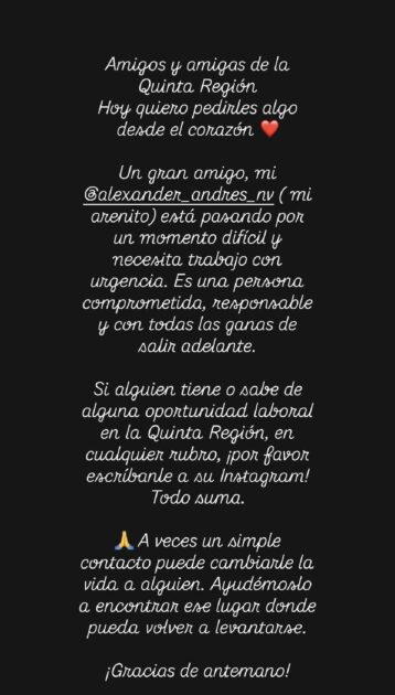 “Si alguien tiene o sabe de alguna oportunidad laboral en la quinta región, en cualquier rubro, por favor escríbanle a su Instagram; todo suma”, añadió.