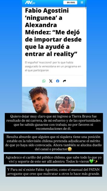 La venezolana Alexandra Méndez, ‘Chama’, respondió a la acusación de Fabio Agostini de haberle pedido fingir intimidad en Tierra Brava. Desmintió en Instagram que su ingreso al reality haya sido por favores, destacando su esfuerzo y oportunidades ganadas por mérito propio. Criticó a Agostini por querer adjudicarse su convocatoria, calificándolo como un “patán arrogante”. Agradeció el apoyo del público chileno y se refirió a Agostini como un ser que maltrata a otros para sentirse superior.
