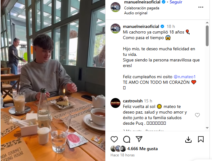 Además, dedicó cariñosas palabras a su hijo, destacando algunas cualidades del joven. “Mi cachorro ya cumplió 18 años. Cómo pasa el tiempo”, partió señalando Neira.