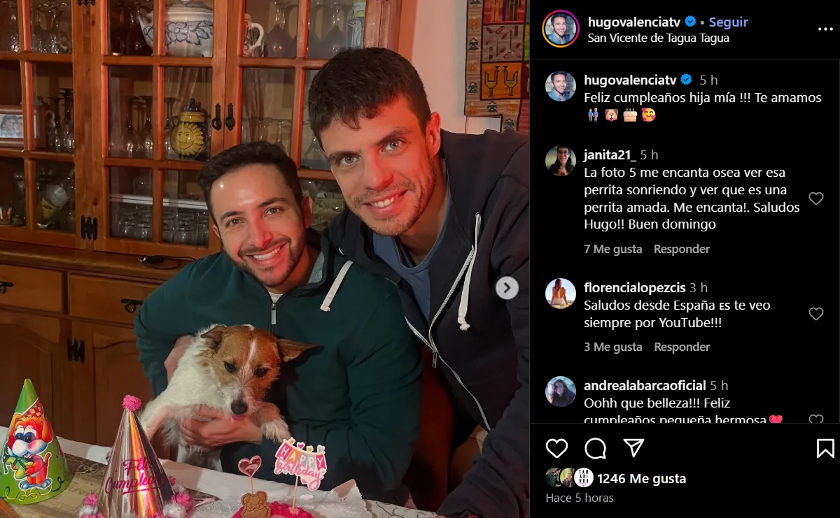 El panelista Hugo Valencia celebró el cumpleaños de su perrita María Rebeca junto a su pareja Ignacio Bravo en su residencia en San Vicente de Tagua Tagua. A través de sus redes sociales, compartieron fotos de la celebración de los tres años de la mascota, expresando su amor por ella. Valencia dedicó un mensaje especial a María Rebeca, demostrando el cariño que sienten por su fiel compañera.