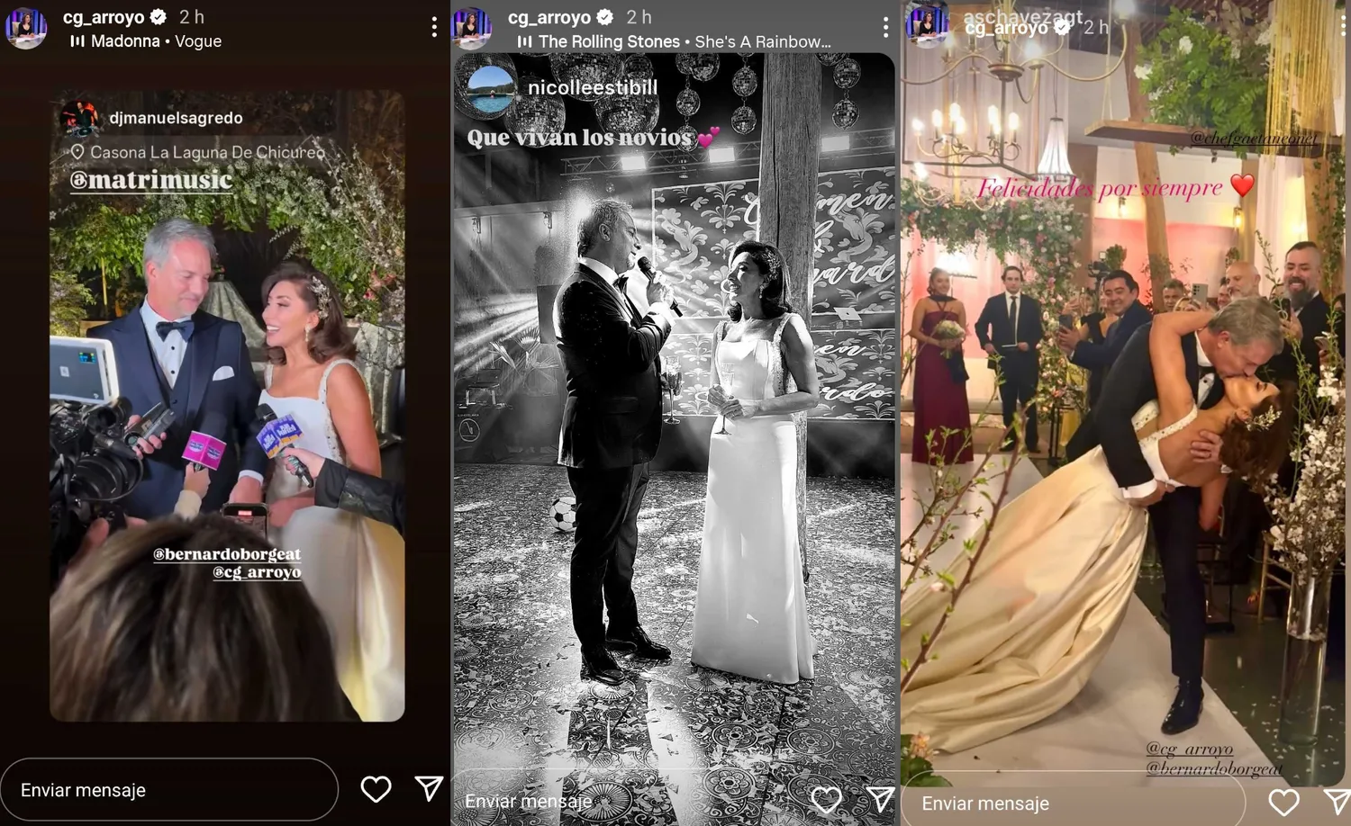 Carmen Gloria Arroyo y Bernardo Borgeat contrajeron matrimonio después de 12 años de relación en una íntima ceremonia en la Casona La Laguna de Chicureo, con la presencia de figuras del espectáculo nacional como Tonka Tomicic y Nacho Gutiérrez. La conductora de TVN compartió fotos y videos del evento, destacando su bello look de novia. Arroyo había mencionado anteriormente que la organización de la boda era un proceso que estaban disfrutando, donde sus hijos tendrían un papel crucial, y confirmó que solo utilizaría un vestido para la ocasión.