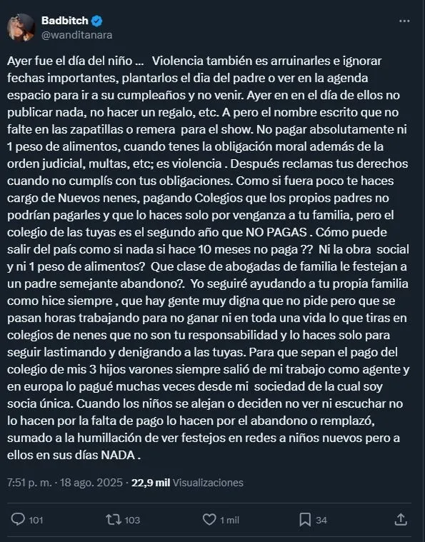 "Ayer fue el día del niño… violencia también es arruinarles e ignorar fechas importantes, plantarlos el día del padre o ver en la agenda espacio para ir a su cumpleaños y no venir. Ayer, en el día de ellos, no publicar nada, no hacer un regalo, etc.", y sumó picante: "A, pero el nombre escrito que no falte en las zapatillas o remera para el show. No pagar absolutamente ni 1 peso de alimentos, cuando tenés la obligación moral, además de la orden judicial, multas, etc.; es violencia".