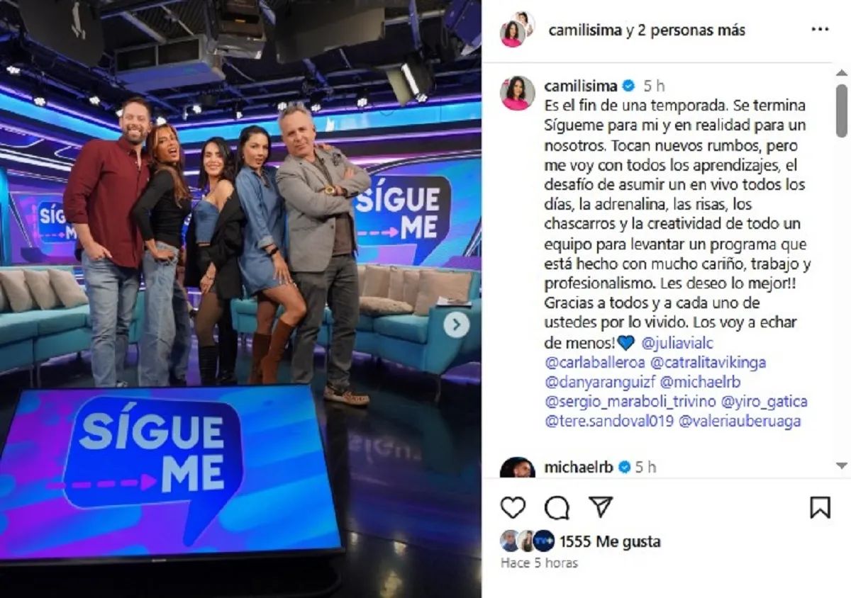 “Se termina Sígueme para mí y en realidad para un 'nosotros'. Tocan nuevos rumbos, pero me voy con todos los aprendizajes, el desafío de asumir un espacio en vivo todos los días, la adrenalina, las risas, los chascarros y la creatividad de todo un equipo para levantar un programa que está hecho con mucho cariño, trabajo y profesionalismo”, sostuvo.
