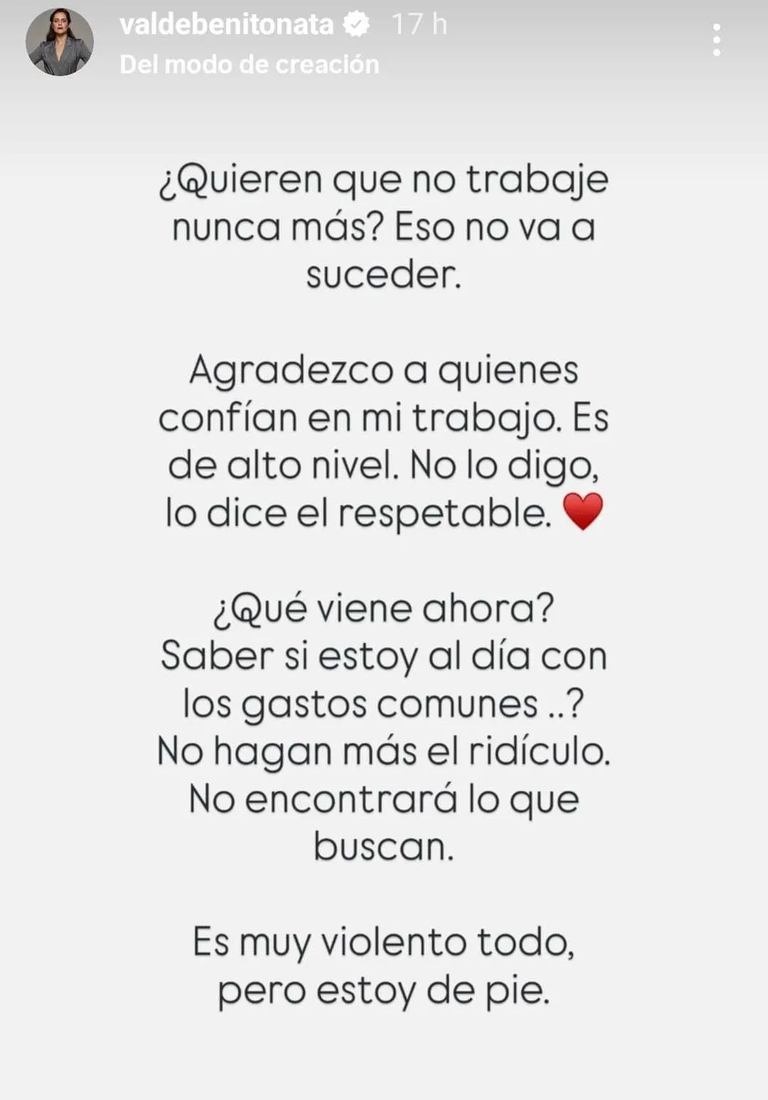 "¿Quieren que no trabaje nunca más? Eso no va a suceder. Agradezco a quienes confían en mi trabajo. Es de alto nivel. No lo digo, lo dice el respetable", partió señalando en una historia de Instagram.