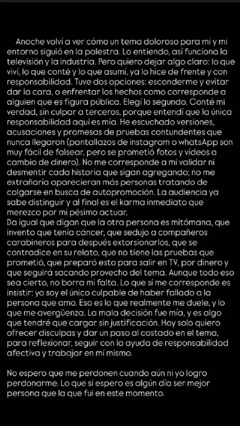 "Anoche volví a ver cómo un tema doloroso para mí y mi entorno siguió en la palestra. Lo entiendo, así funciona la televisión y la industria. Pero quiero dejar algo claro: lo que viví, lo que conté y lo que asumí, ya lo hice de frente y con responsabilidad", comenzó escribiendo la tarde de este lunes.