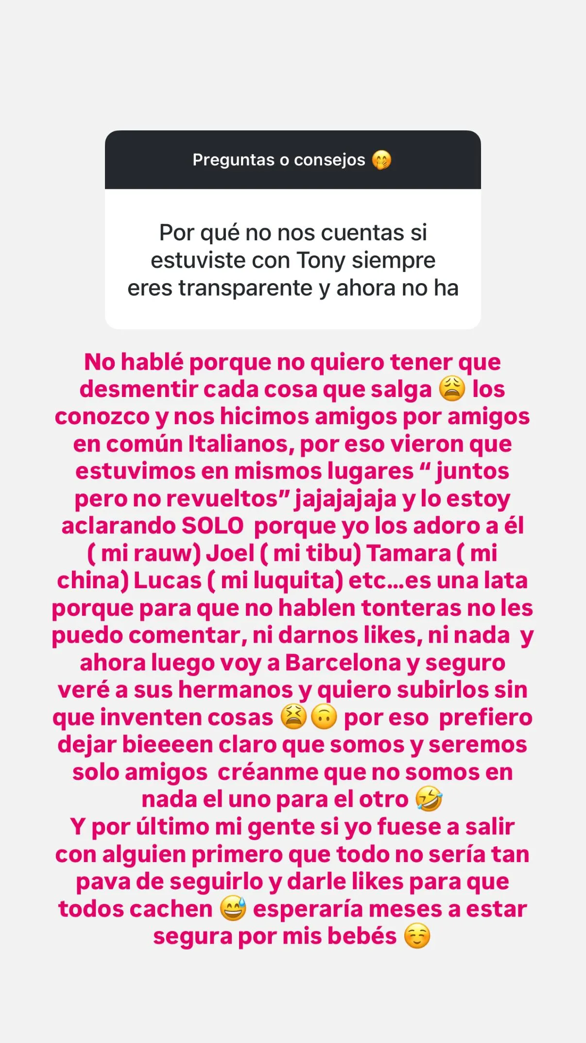 En la misma publicación, Coté López precisó que solo lo estaba aclarando "porque yo los adoro a él (mi Rauw), Joel (mi tribu), Tamara (mi China) y Lucas".