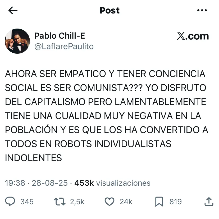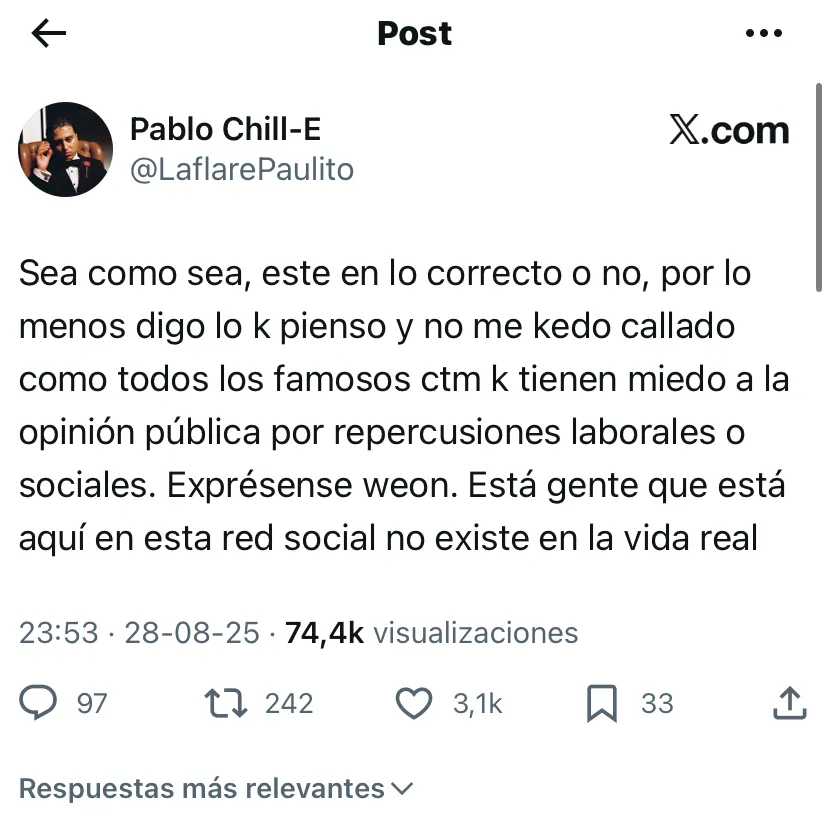 Desarrollado por Bío Bío ComunicacionesEl reconocido exponente del género urbano chileno, Pablo Chill-E, volvió a generar conversación en redes sociales luego de compartir una serie de reflexiones sobre los candidatos a la presidencia de Chile.