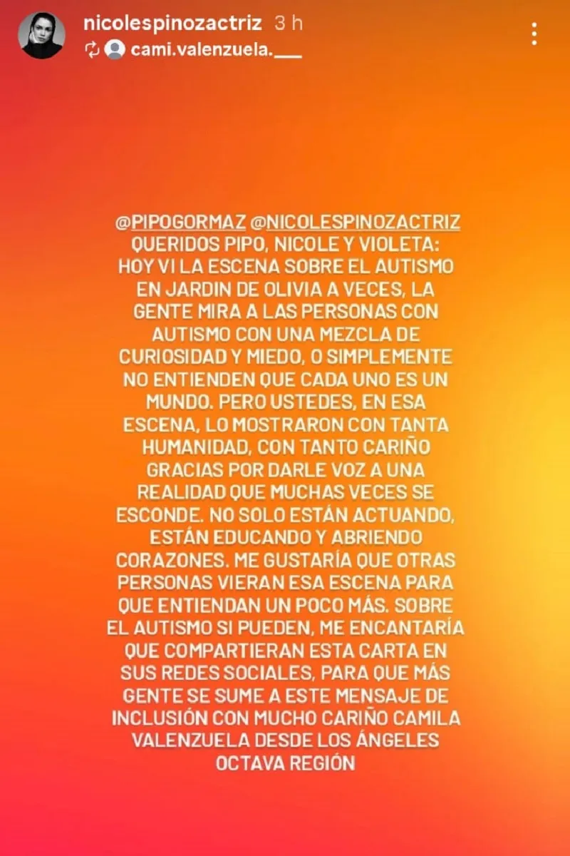 "Queridos Pipo, Nicole y Violeta: Hoy vi la escena sobre el autismo en El Jardín de Olivia. A veces, la gente mira a las personas con autismo con una mezcla de curiosidad y miedo, o simplemente no entienden que cada uno es un mundo", comenzó escribiendo.