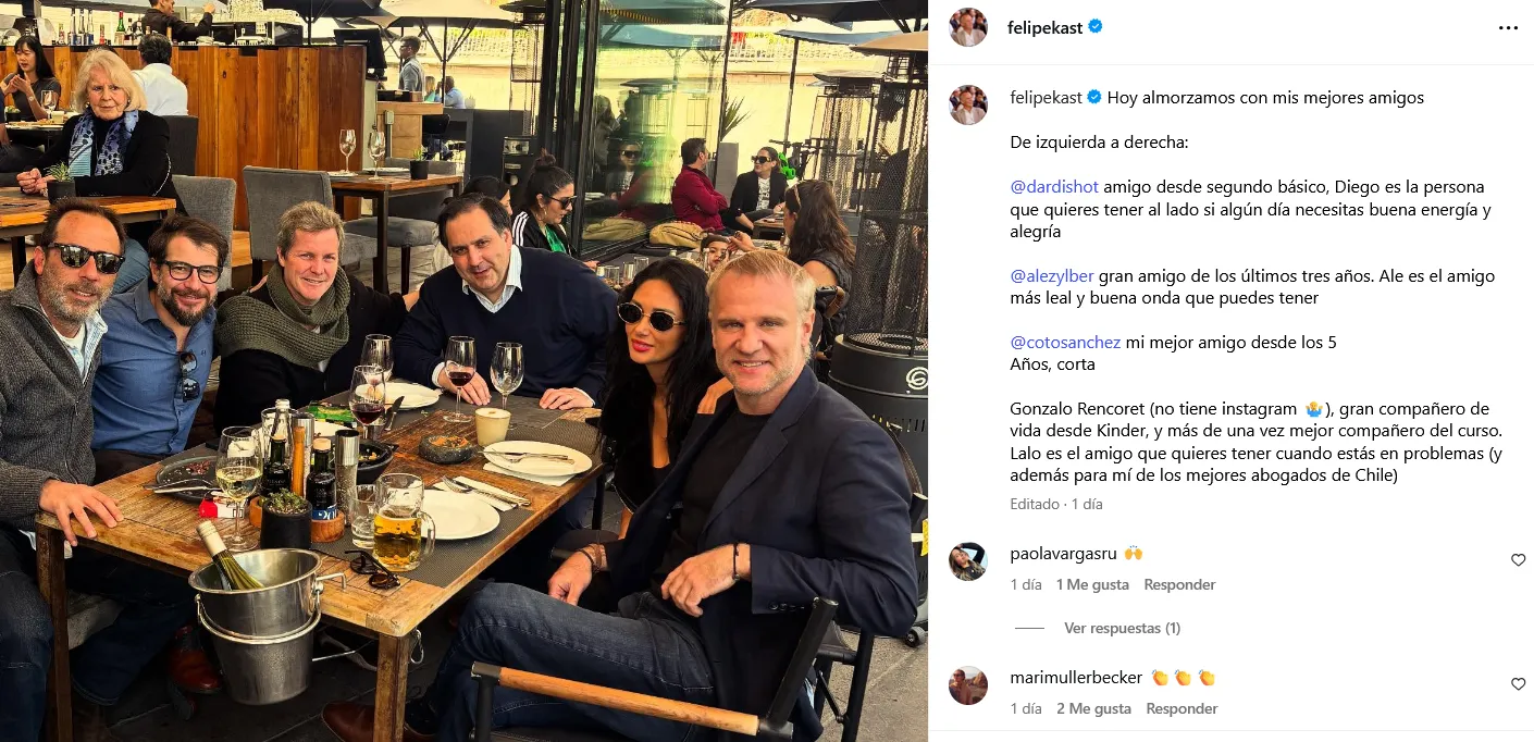 Felipe Kast compartió un almuerzo especial con sus amigos, incluyendo a su pareja, Pamela Díaz, que fue documentado en Instagram. El senador detalló cada uno de los presentes y resaltó la importancia de sus amistades de toda la vida. Pame confirmó hace un tiempo su relación con Kast en un pódcast, expresando su tranquilidad y felicidad en esta etapa de su vida.