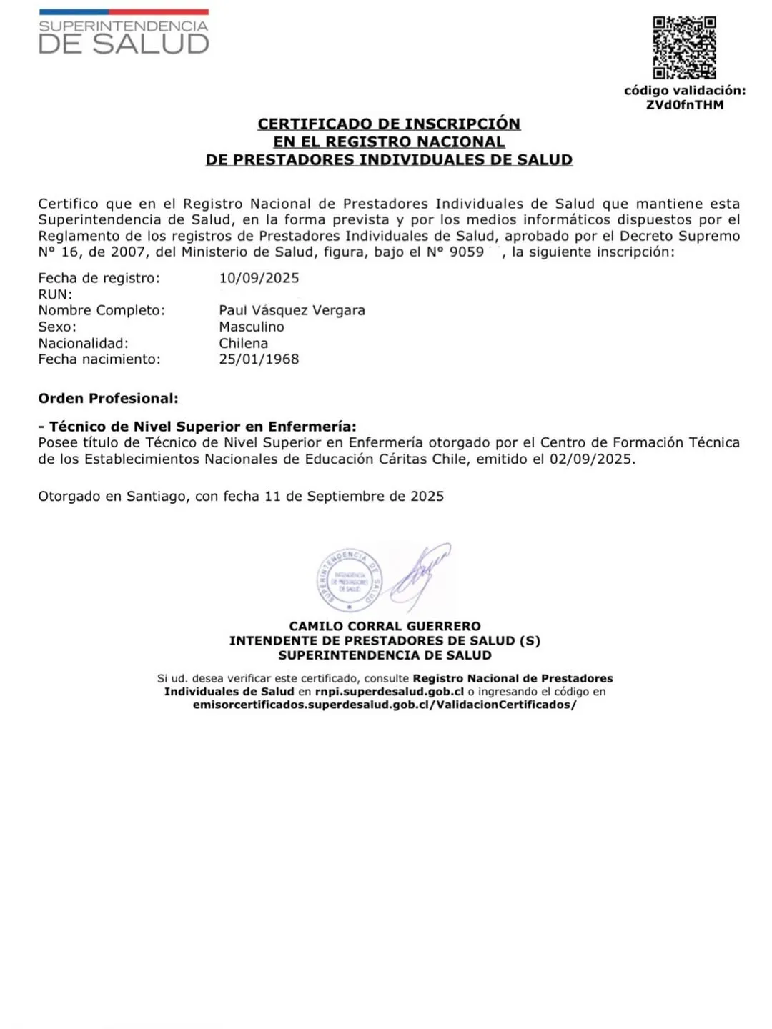 En el documento se detalla: "Posee título de Técnico de Nivel Superior en Enfermería otorgado por el Centro de Formación Técnica de los Establecimientos Nacionales de Educación Cáritas Chile, emitido el 02/09/2025. Otorgado en Santiago, con fecha 11 de Septiembre de 2025".