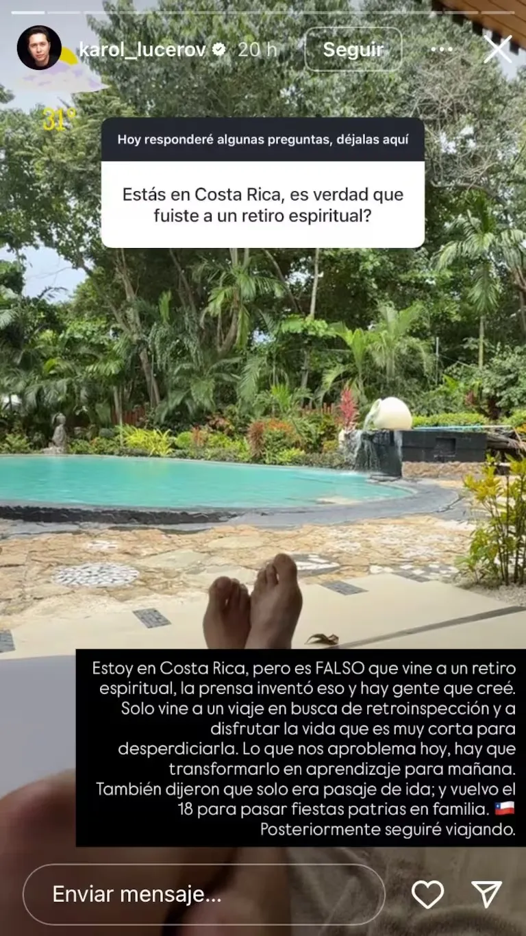 Karol Lucero desmiente haber realizado un retiro espiritual en Costa Rica luego de su separación con Fran Virgilio. El influencer compartió en redes sociales su viaje de "introspección", mostrando actividades como sesiones intensivas y días en la playa. Aclaró que su estadía no fue por motivos espirituales, sino para reflexionar y disfrutar la vida. Planea regresar a Chile para celebrar Fiestas Patrias en familia y continuar con sus viajes.