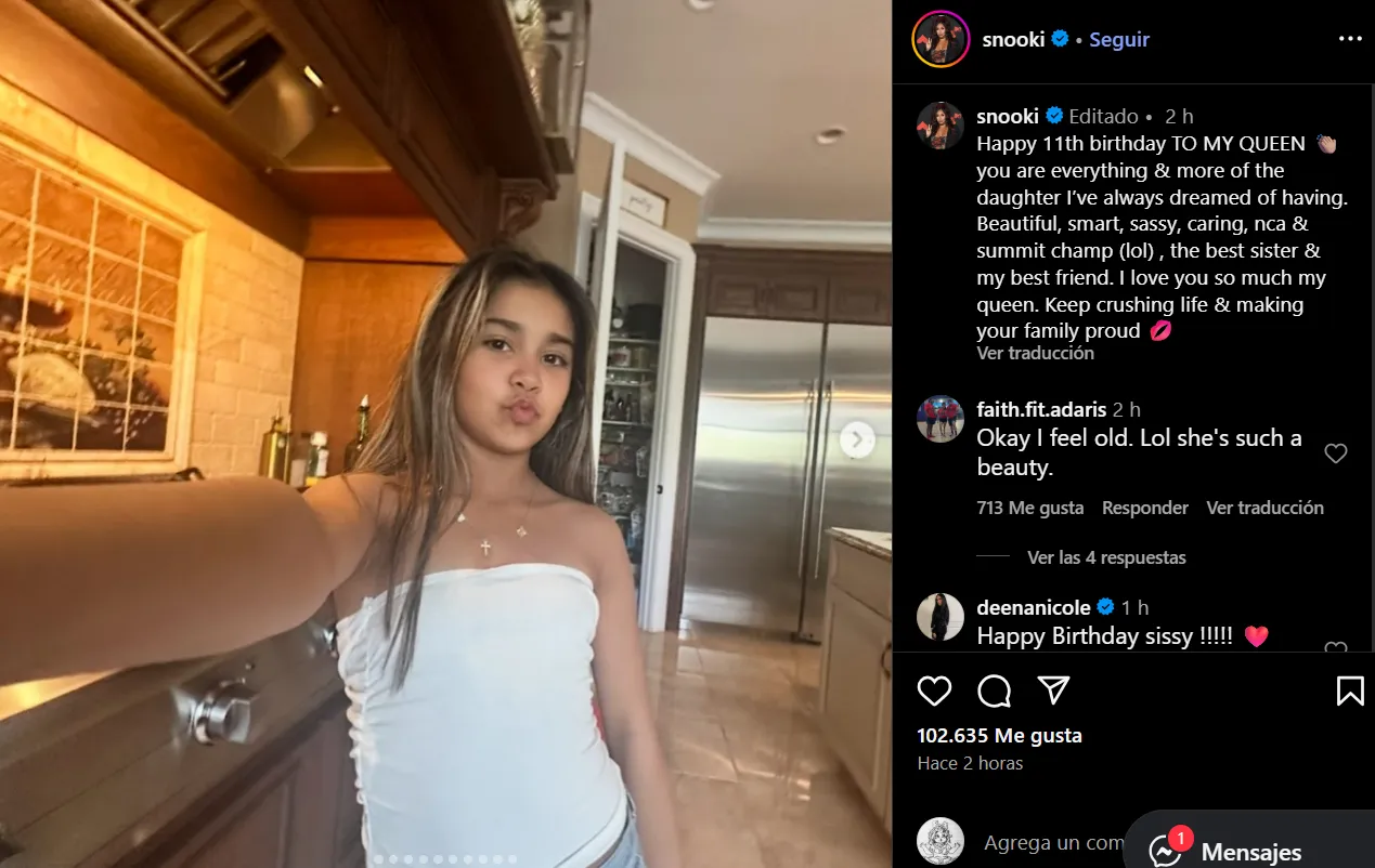 "Feliz cumpleaños número 11 a mi reina. Eres todo y más de la hija que siempre soñé tener. Hermosa, inteligente, atrevida, cariñosa, campeona de NCA y Summit, la mejor hermana y mi mejor amiga", escribió Snooki a su hija.