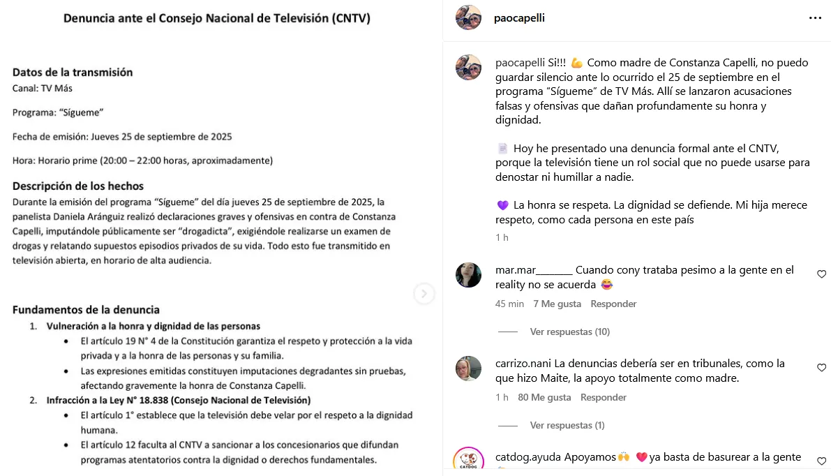 Paola Capelli, madre de Constanza, denunció a Daniela Aránguiz ante el CNTV por llamar a su hija "regalada" y "drogadicta". Aránguiz hizo estos comentarios en el programa Sígueme de TV+, tras críticas de Capelli. La madre de la bailarina manifestó en Instagram que las acusaciones afectaron la honra de su hija y presentó la denuncia para proteger su dignidad y exigir respeto.