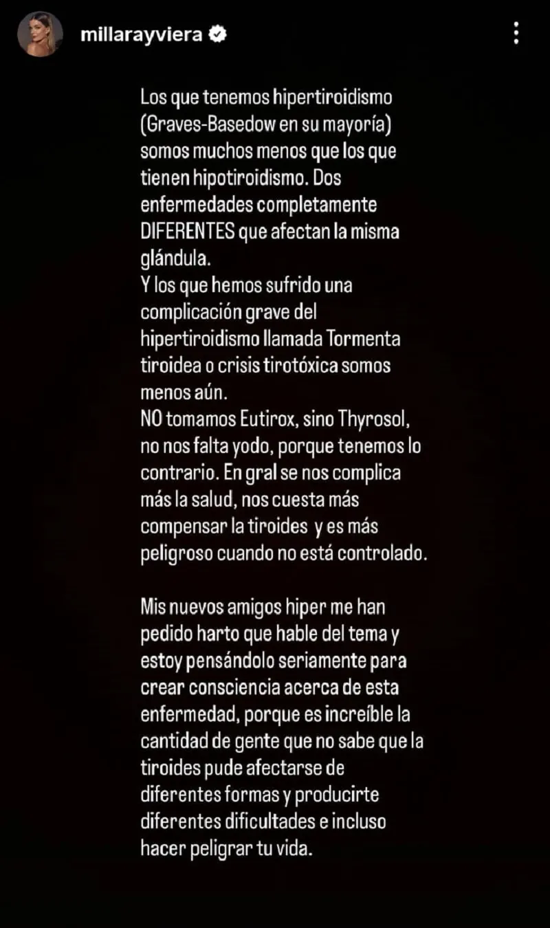 "Los que tenemos hipertiroidismo somos muchos menos de los que tienen hipotiroidismo. Dos enfermedades completamente diferentes que afectan la misma glándula", comenzó escribiendo.