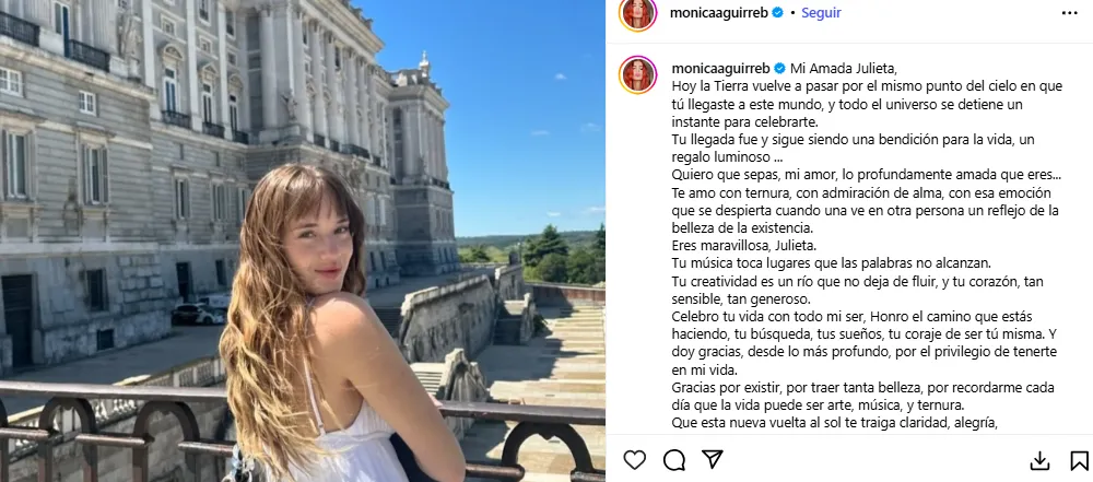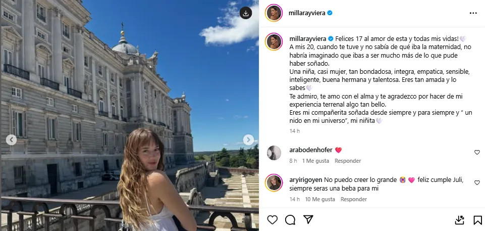 En su publicación, expresó: “Felices 17 al amor de esta y todas mis vidas. A mis 20, cuando te tuve y no sabía de qué iba la maternidad, no habría imaginado que ibas a ser mucho más de lo que pude haber soñado. Una niña, casi mujer, tan bondadosa, íntegra, empática, sensible, inteligente, buena hermana y talentosa".