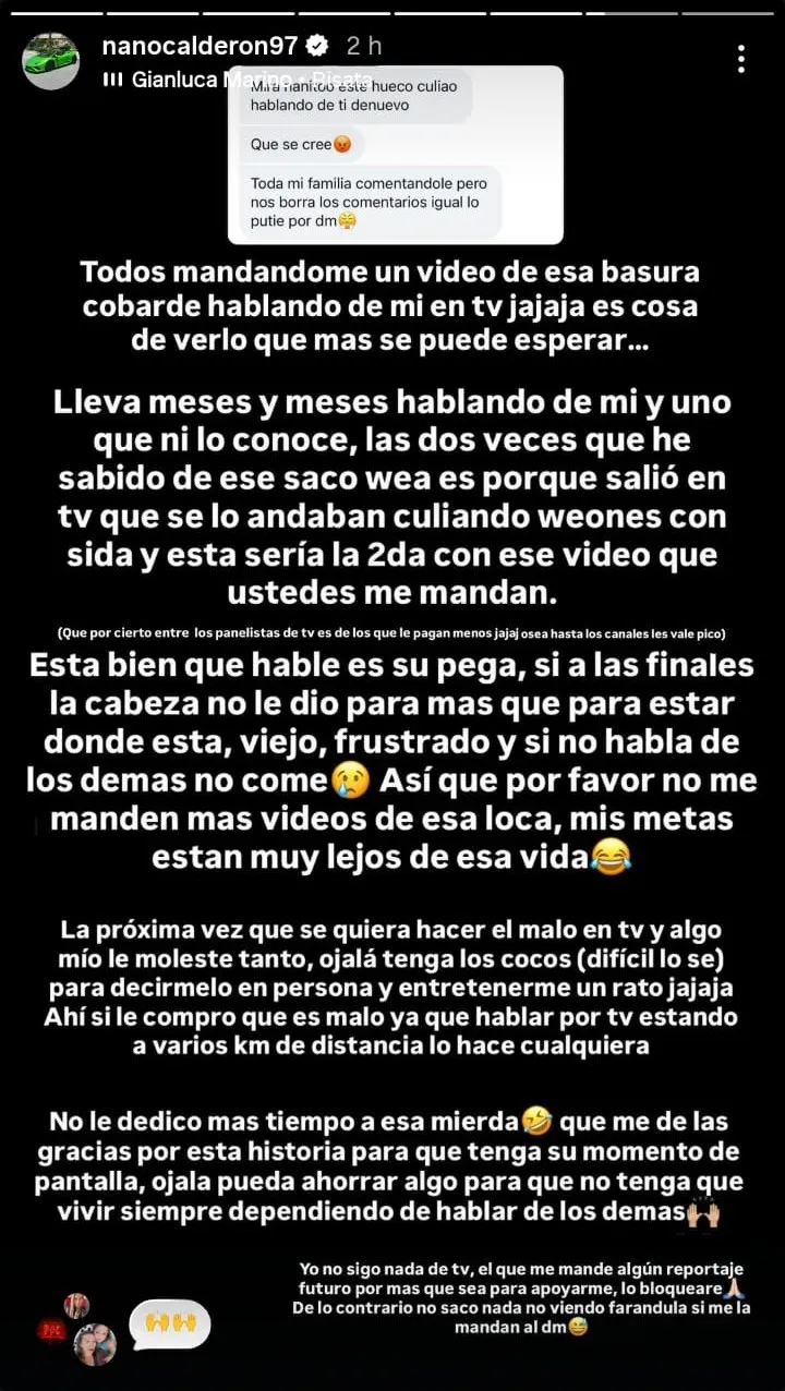 Nano Calderón respondió en duros términos a Sergio Rojas, quien lo llamó "delincuente" en TV tras el audio de 'La Quintrala' contra Daniella Campos. El joven reaccionó en Instagram, calificando al periodista de "cobarde" y advirtiéndole sobre futuras críticas. Calderón cuestionó la valentía de Rojas y lo desafió a enfrentarlo personalmente si tiene algo más que decir.