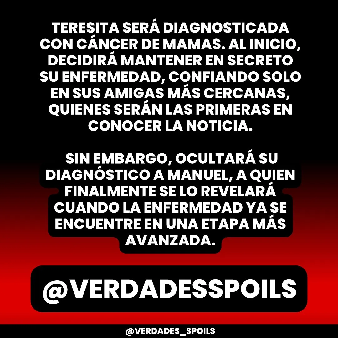 "Sin embargo, ocultará su diagnóstico a Manuel, a quien finalmente se lo revelará cuando la enfermedad ya se encuentre en una etapa más avanzada", agregaron.