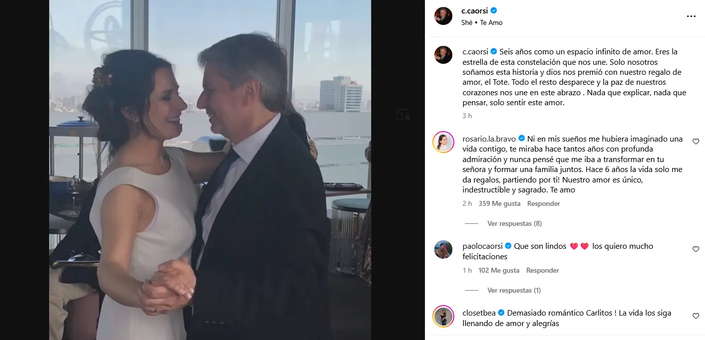 Rosario Bravo y Carlos Caorsi celebraron seis años de matrimonio con emotivos mensajes y fotos en redes sociales. La enfermera agradeció a Dios por su profundo amor y familia, mientras que el cardiólogo describió su unión como un "espacio infinito de amor" y mencionó a su hijo en común. Ambos expresaron su amor único e indestructible, agradeciendo a Dios por lo que les ha dado.