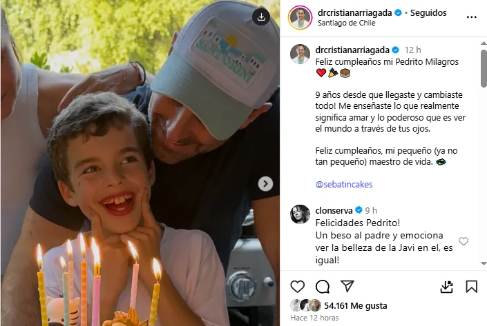 El cirujano plástico Cristián Arriagada compartió un emotivo fin de semana celebrando el cumpleaños de Pedrito Milagros, hijo de la fallecida periodista Javiera Suárez, quien cumplió 9 años. A través de sus redes sociales, Arriagada mostró fotos del pequeño soplando las velas junto a su padre, expresando su amor y gratitud por enseñarle el significado del verdadero amor. Rostros del espectáculo como Claudia Conserva, María Luisa Godoy y María José Prieto también enviaron saludos al cumpleañero, destacando la belleza heredada de su madre.