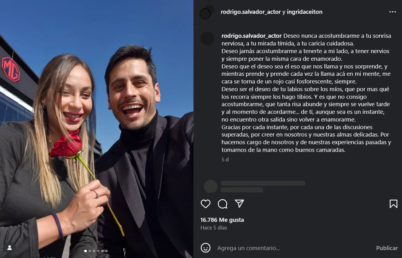 En el texto, Rodrigo dedicó un extenso relato a su pareja. "Deseo nunca acostumbrarme a tu sonrisa nerviosa, a tu mirada tímida, a tu caricia cuidadosa", comenzó el mensaje.