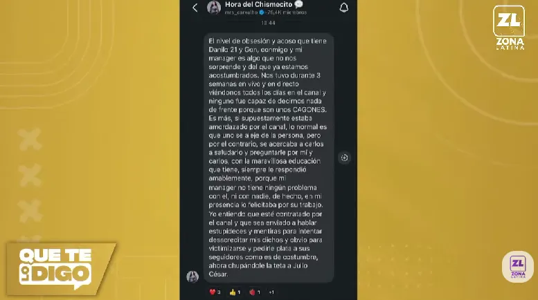 En su mensaje, Carvalho aseguró que “el nivel de obsesión y acoso que tiene Danilo 21 y Gon conmigo y mi manager, es algo que no nos sorprende y del que ya estamos acostumbrados”.