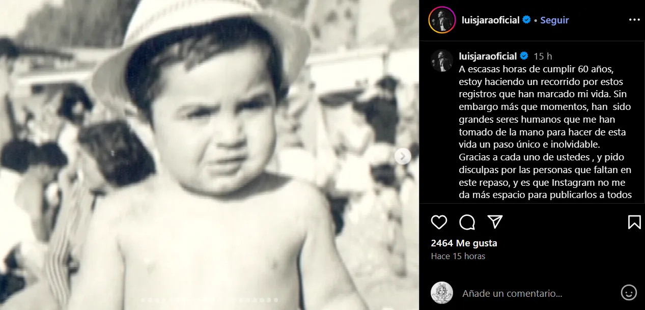 El cantante Luis Jara celebró su cumpleaños número 60 con un recorrido por su vida, compartiendo recuerdos desde su infancia hasta la actualidad en Instagram. En las imágenes se observa su evolución desde bebé hasta su vida adulta, destacando la importancia de sus seres queridos. Agradeció a sus seguidores y se disculpó por no poder incluir a todos en la publicación debido a limitaciones de espacio en la red social.