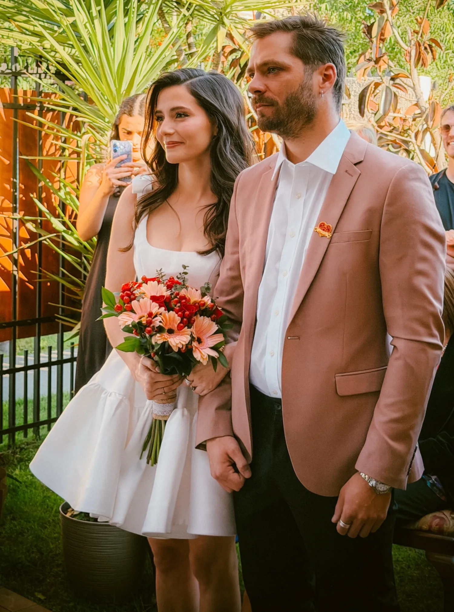 En sus manos, sostiene un bello ramo de flores de colores, mientras posa frente a quien sería su ahora marido.