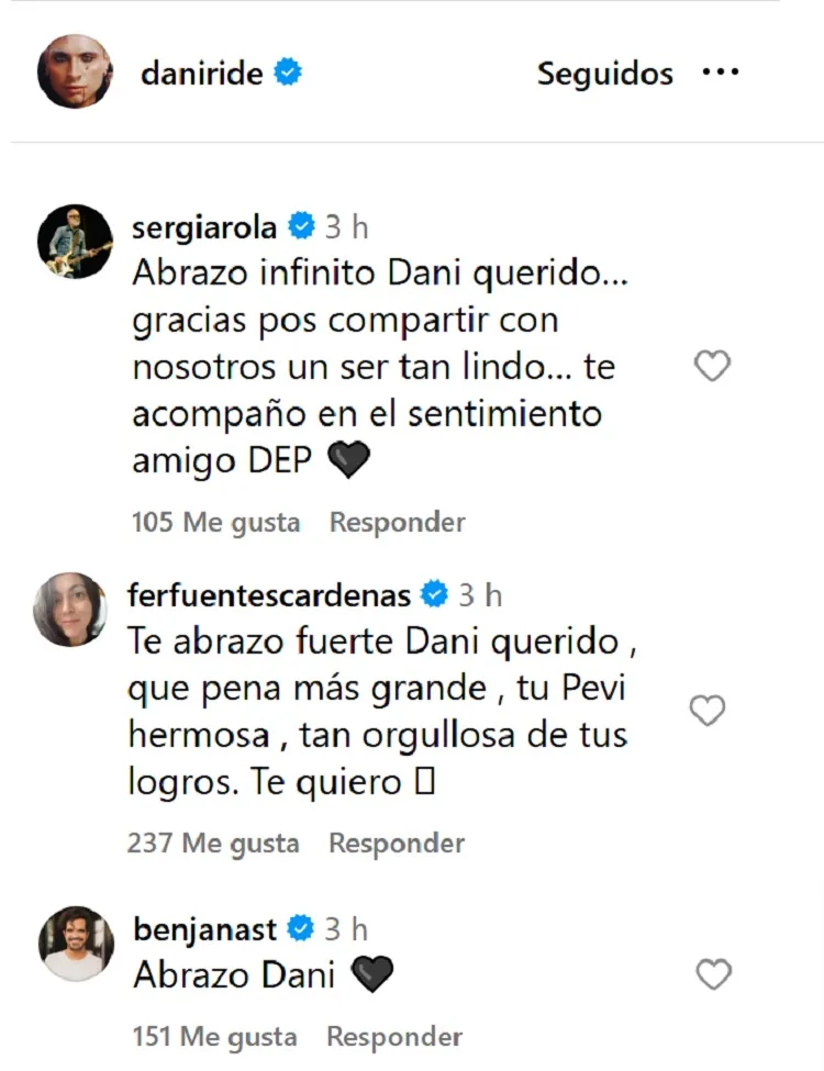 "Te abrazo fuerte, Dani querido. Qué pena más grande. Tu Pevi hermosa, tan orgullosa de tus logros. Te quiero", añadió Fer.