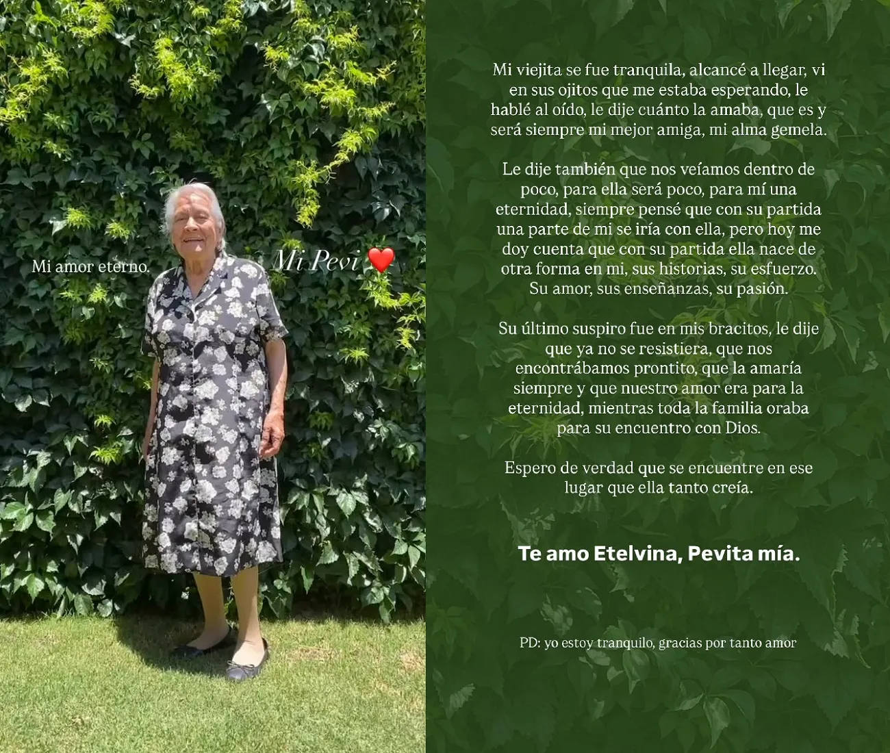 "Espero de verdad que se encuentre en ese lugar que ella tanto creía. Te amo, Etelvina, Pevita mía", agregó.