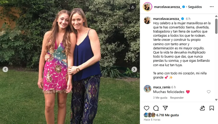 Vacarezza añadió que “verte crecer y construir tu propio camino con tanto amor y determinación es mi mayor orgullo. Que la vida te devuelva multiplicado todo lo bueno que das, que nunca pierdas tu sonrisa y que sigas brillando con esa luz tan tuya”.